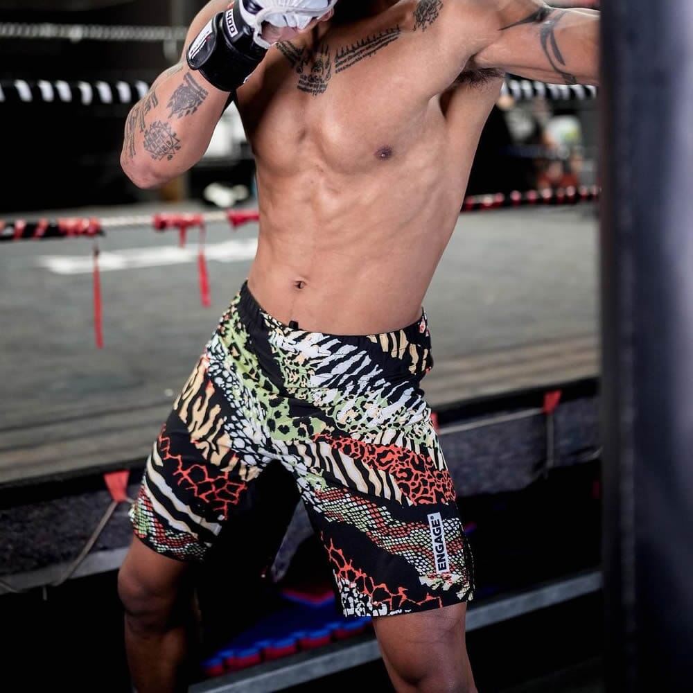 Built for absolute animals in the gym. These unique fight shorts feature a number of the most iconic animal prints. Own the gym and strive to be king of the Jungle in the latest fight short from ENGAGE. Engineered to maximise movement and provide unparalleled comfort, these ultra-lightweight fight shorts feature a longer cut and a shorter 50mm side split compared to our MMA Hybrid Shorts and are a staple for any skill-level practitioner.