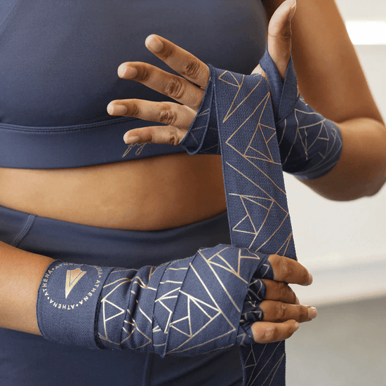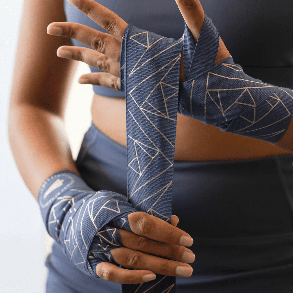 Our Berry hand wrap returns with an updated softer tone, perfectly matched to our Eris Sports Bra (Stone Blue) and Eris Shorts (Stone Blue)! A striking hand wrap made with soft but durable cotton to keep your hands protected during training and sparring. Featuring metallic gold printed along the 180" wrap, the Eris hand wrap brings a new style of femininity to your Boxing, Kickboxing, Muay Thai and MMA training.