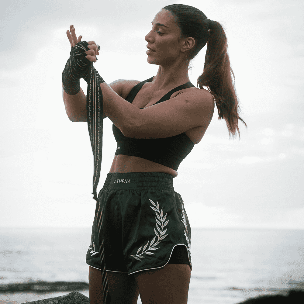 The first ever Muay Thai Shorts made for women's bodies! Athena created the first ever muay thai shorts specifically cut and designed to fit the shape of women's bodies. Normal muay thai shorts have a smaller waist to hip ratio that works well with men's straight bodies, meaning women generally need to size up to get the right hip/leg space and then pull that drawstring super tight to get the waist to fit.