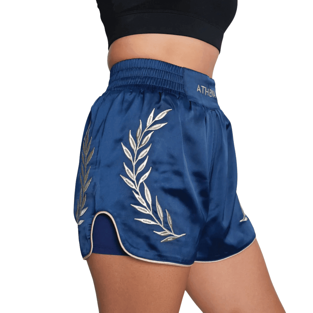 The first ever Muay Thai Shorts made for women's bodies! Athena created the first ever muay thai shorts specifically cut and designed to fit the shape of women's bodies. Normal muay thai shorts have a smaller waist to hip ratio that works well with men's straight bodies, meaning women generally need to size up to get the right hip/leg space and then pull that drawstring super tight to get the waist to fit.