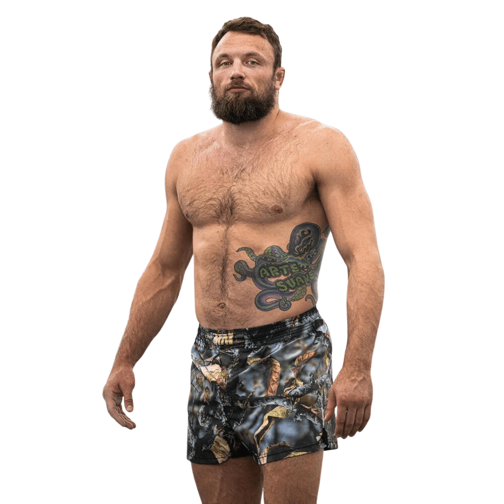 Has anybody seen Craig? You can barely see him in his brand new Hillbilly Camo shorts! In the same high-cut style we have all grown to love, these MMA shorts give you the space to do those limb tangling moves BJJ demands.